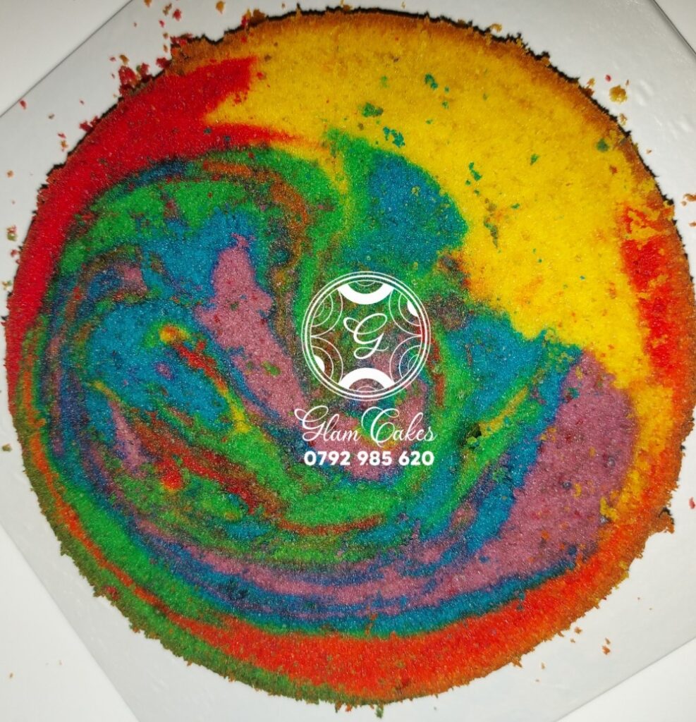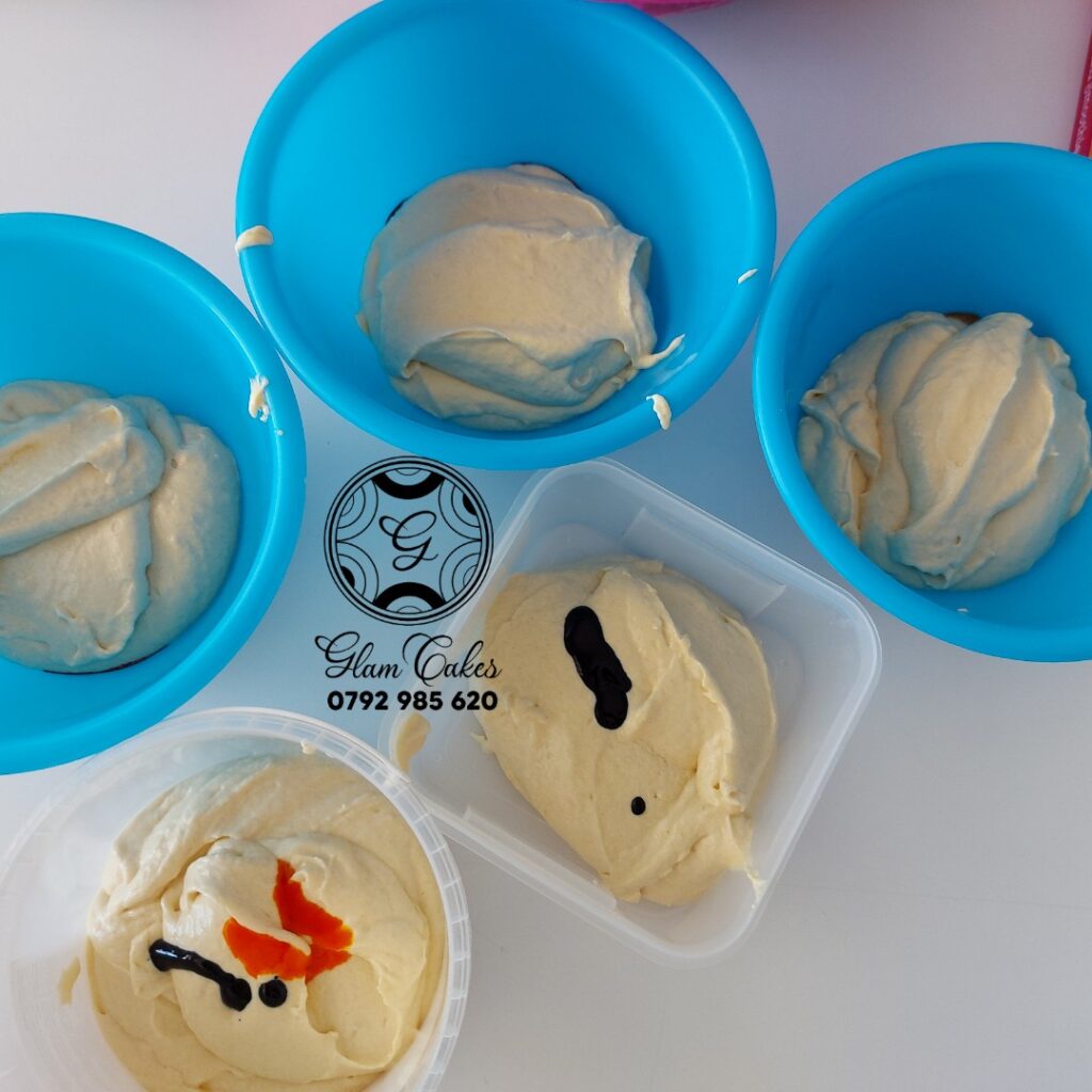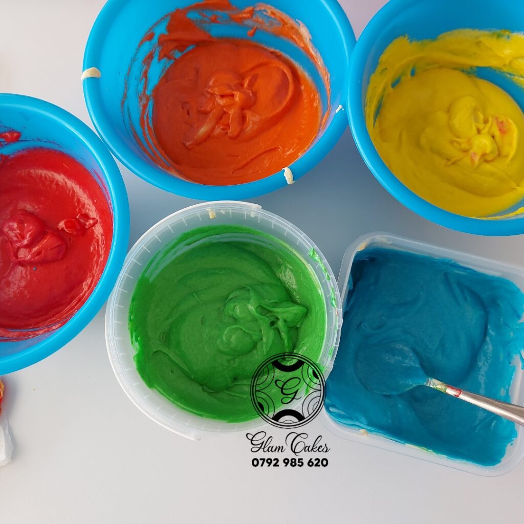 - Divide the cake batter into 4 bowls and add your desired colour in each of them.